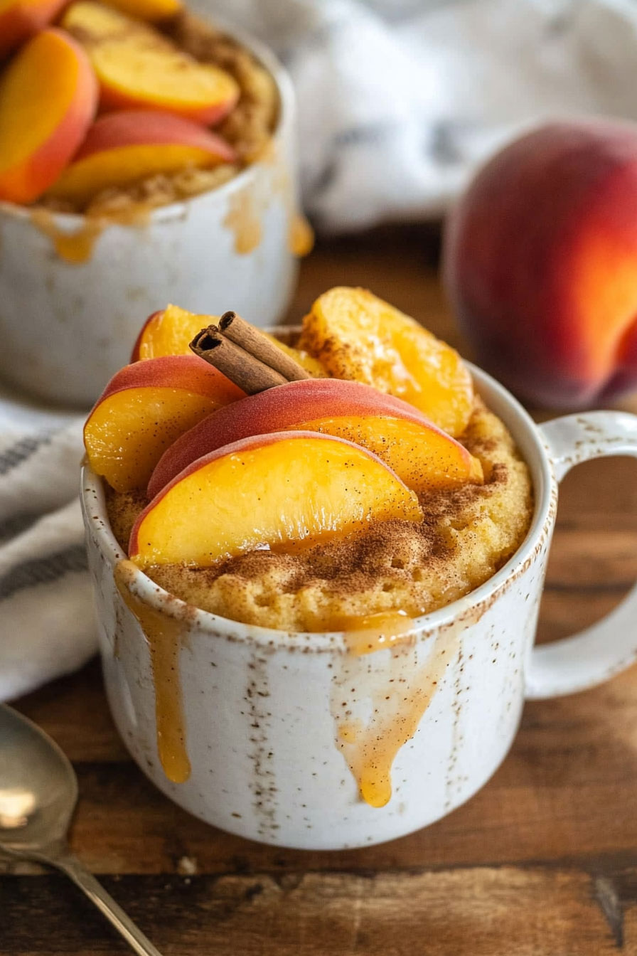 This mug cake is best enjoyed fresh, but you can prepare the batter and peach base separately up to a few hours in advance. Assemble and microwave just before serving for the best texture and flavor.