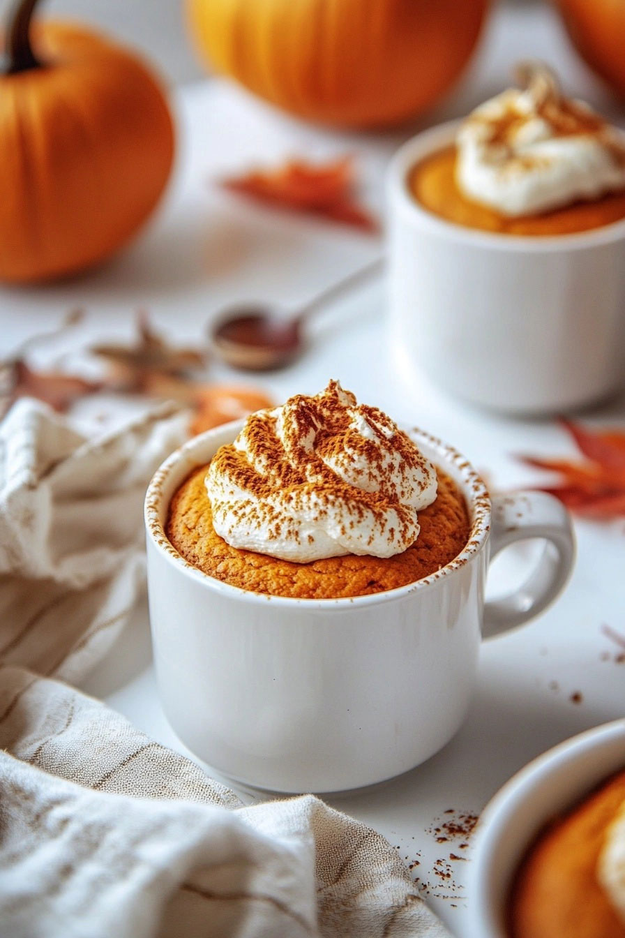 • Chocolate Pumpkin Mug Cake: Add 1 tablespoon of cocoa powder to the batter for a rich chocolate twist. You can also sprinkle chocolate chips on top before microwaving for an extra indulgence[1].